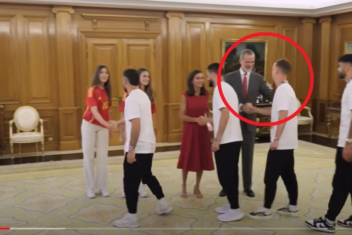 Los futbolistas de La Roja fueron pasando uno a uno dando la mano al rey, a Letizia, a la princesa Leonor y a la infanta Sofía. Todos ellos mostraron sorpresa a ver a Marc Cucurella con el pelo recogido y la reina dedicó unas palabras especiales a Rodri, a quien le dijo: "¡No tienes voz!".