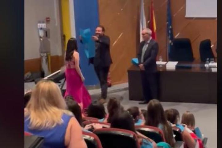 En el momento en el que llaman a Sabela, se levantó y caminó con el vestido rosa para que le colocaras la banda. Fue en el preciso instante en el que estrechaba la mano con distintos profesores cuando su novio gritó: "¡Guapa! ¡Es mi novia":