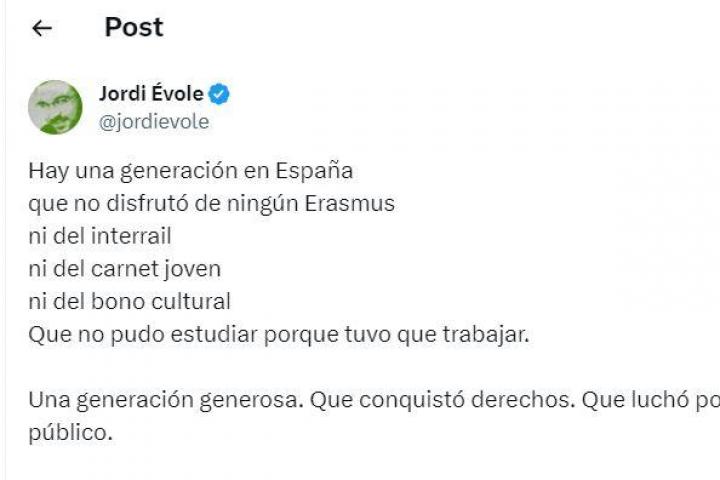 "Hay una generación en España que no disfrutó de ningún Erasmus, ni del interrail, ni del carnet joven, ni del bono cultural. Que no pudo estudiar porque tuvo que trabajar. Una generación generosa. Que conquistó derechos. Que luchó por lo público. La generación de hierro", escribió el periodista.