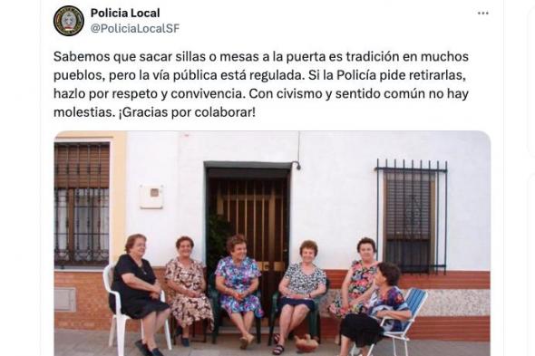 "Sabemos que sacar sillas o mesas a la puerta es tradición en muchos pueblos, pero la vía pública está regulada. Si la Policía pide retirarlas, hazlo por respeto y convivencia", comienza escribiendo el cuerpo en la publicación.