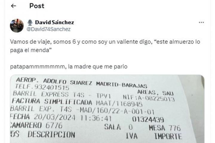 El usuario de X @David74Sanchez ha publicado el ticket del almuerzo para seis personas que ha tenido que pagar en el Aeropuerto Adolfo Suárez Madrid-Barajas tras ofrecerse a invitar a sus acompañantes; claro que ha ocurrido antes de ser consciente de los elevados precios.