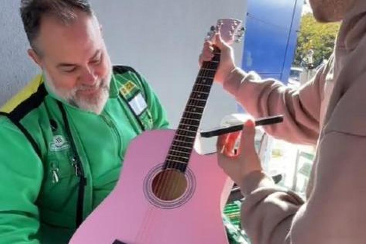 Se olvida la cartera e intenta pagar al cuponero regalándole una guitarra