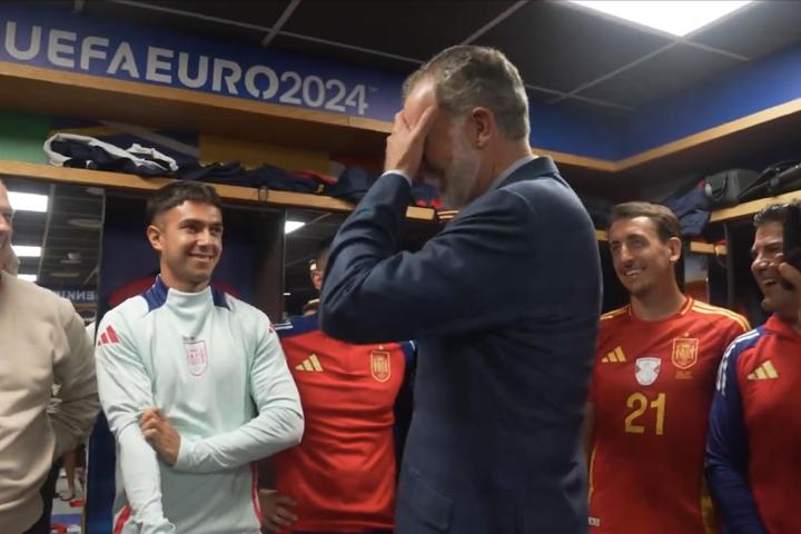 Curioso momento el que se vivió este jueves en el vestuario de la Selección Española con el rey Felipe VI como protagonista y los jugadores como actores secundarios. Las cámaras de la RFEF han mostrado cómo el monarca fue saludando uno a uno a los futbolistas que celebraban la victoria por 1-0 frente a Italia.