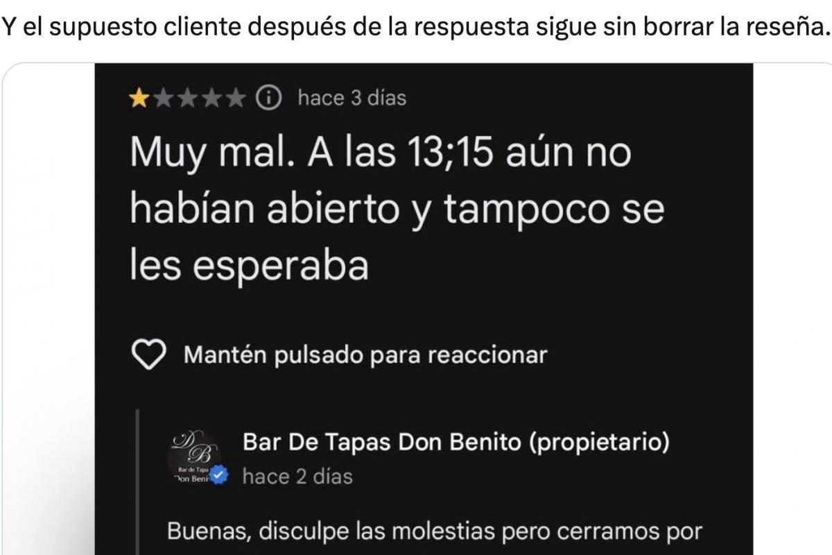 A pesar de las aclaraciones, de momento, y tal y como ha reseñado Soy Camarero en su perfil de X, esta persona no ha borrado la reseña sobre el cierre del bar aún sabiendo que estaba cerrado por el fallecimiento de la dueña.