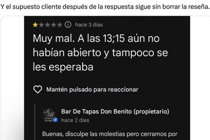 "Porque hay gente que pone reseñas sin importarle la causa por la que el establecimiento está cerrado, igual ni se ha mirado la respuesta, penoso", dice uno de los comentarios.