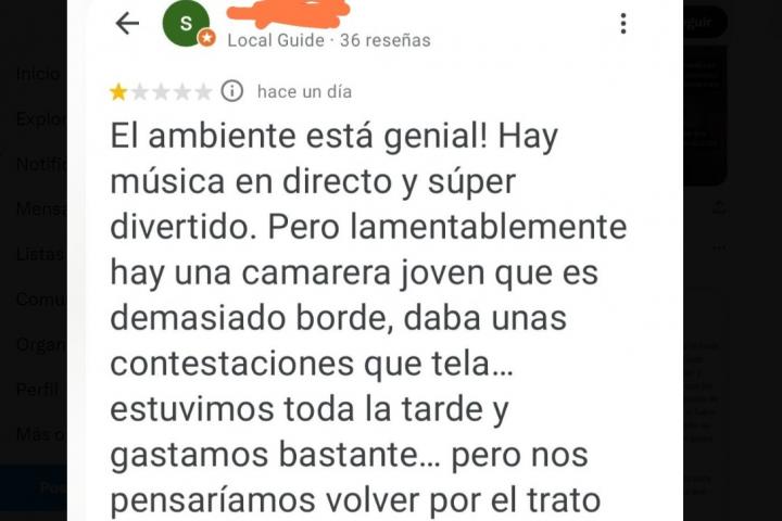 "El ambiente está genial! Hay música en directo y súper divertido. Pero, lamentablemente, hay una camarera joven que es demasiado borde, daba unas contestaciones que tela...", empieza describiendo el cliente.