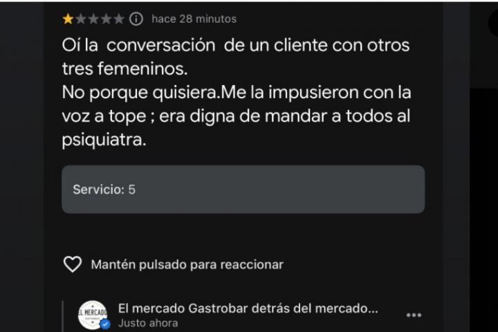 Otra persona es igualmente dura con el comensal: "Seguramente esa o ese cliente que estaba escuchando una conversación que no le incumbía estaba muy aburrid@ con la compañía que había ido al bar, seguramente no tiene vida propia y le gusta meterse donde no le llaman, pero aún así su reseña no se entiende… debería haber una calificación para los clientes porque algunos sencillamente son indeseables".