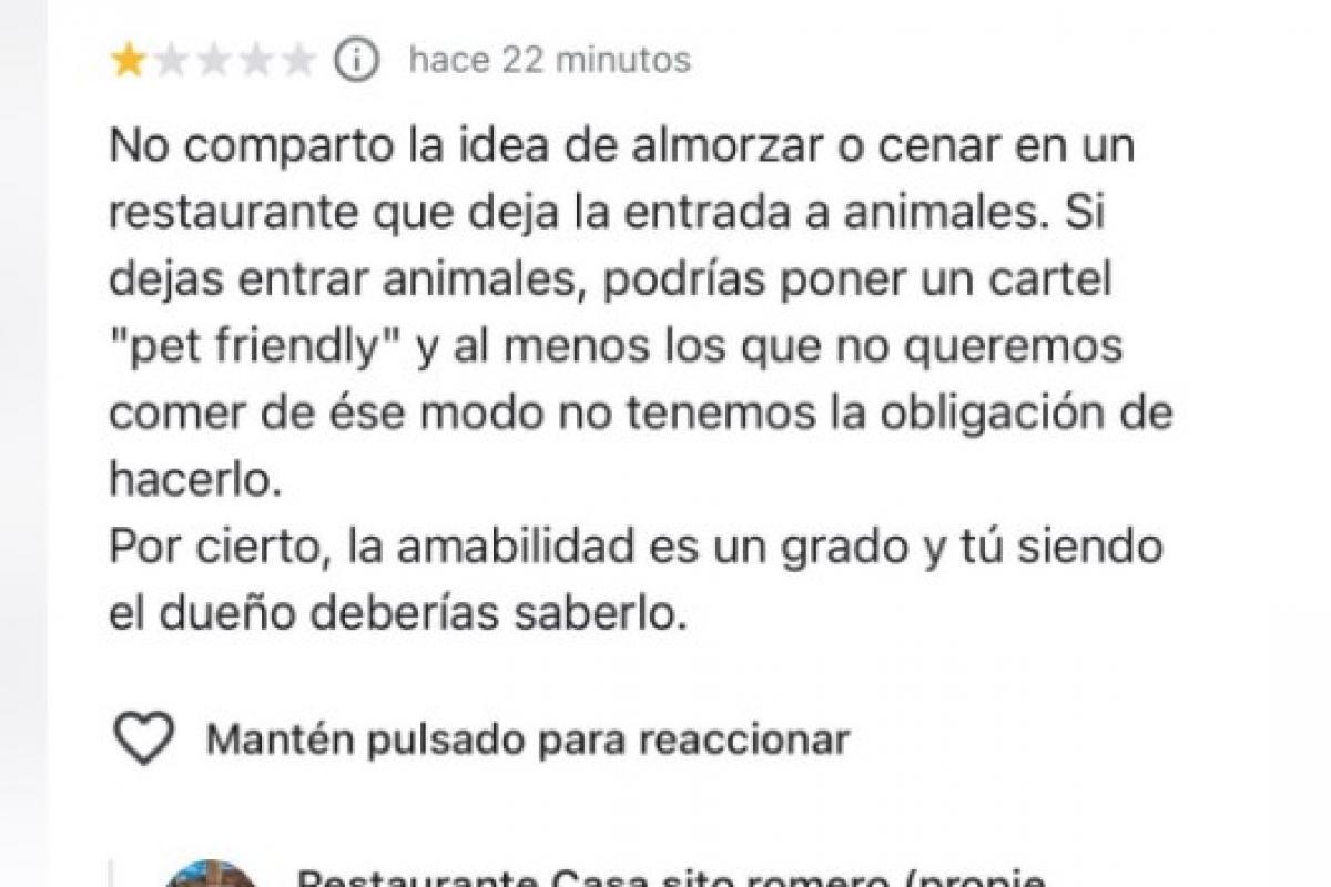 "No comparto la idea de cenar o almorzar en un restaurante que deja la entrada a animales. Si dejas entrar a animales, podrías poner un cartel 'pet friendly' y al menos los que no queremos comer de ese modo no tenemos la obligación de hacerlo. Por cierto, la amabilidad es un grado y tú, siendo el dueño, deberías saberlo", dice el comensal.
