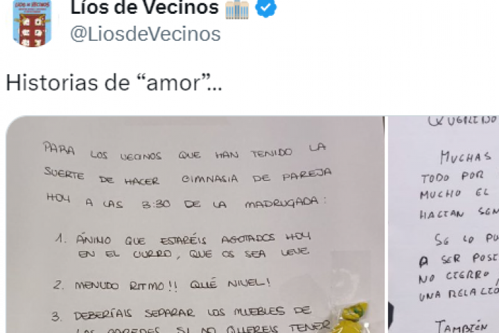 Así lo ha mostrado la cuenta de X, antes Twitter, @LiosdeVecinos, que ha compartido dos imágenes: el cartel de un vecino quejándose de los ruidos ocasionados de madrugada y la respuesta del aludido. Y ha escrito: "Historias de 'amor'...".