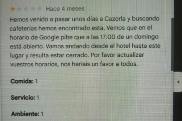 En su escrito, esas personas se quejan se que han ido a pasar unos días a Cazorla y, buscando cafeterías, han encontrado esa. "Vemos que en el horario de Google pone que a las 17.00 un domingo está abierto. Vamos andando desde el hotel hasta ese lugar y resulta que está cerrado", explica.
