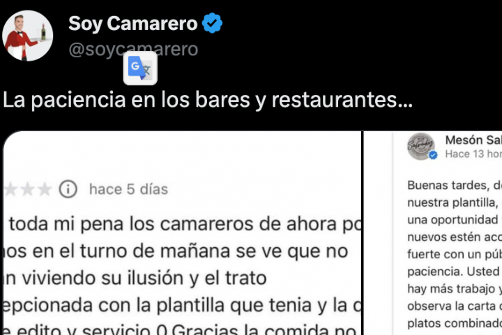La cuenta de Twitter @soycamarero, dedicada a compartir contenido relacionado con la hostelería, ha publicado en la red social una de estas reseñas, en las que el propietario del establecimiento han dejado una respuesta impecable. "La paciencia en los bares y restaurantes...", ha escrito el tuitero.