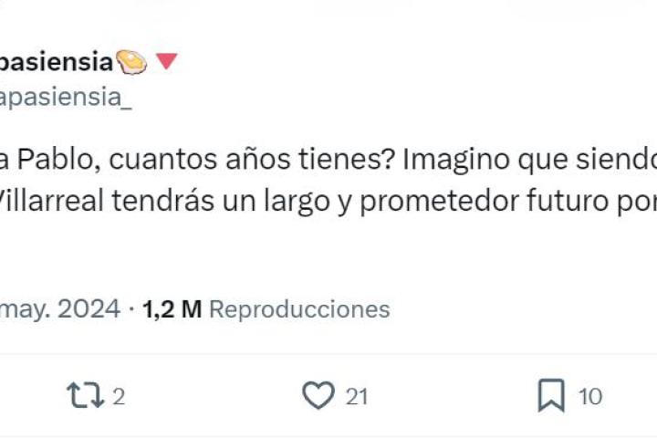 Ahí es cuando un usuario decidió preguntarle la edad de forma irónica: "Una pregunta Pablo, ¿Cuántos años tienes? ¿Imagino que siendo futbolista del filial del Villarreal tendrás un largo y prometedor futuro por delante, no?".