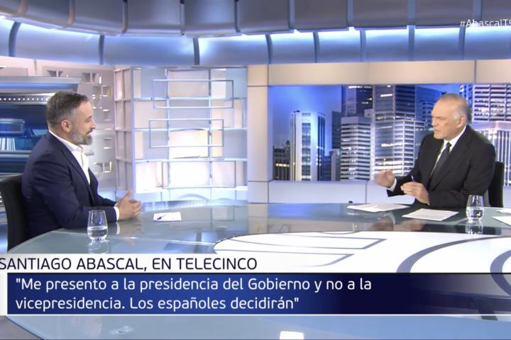Pedro Piqueras ha entrevistado este martes a Santiago Abascal en Informativos Telecinco en su ronda con los candidatos de los cuatro principales partidos de España. El lunes estuvo con Yolanda Díaz, después con Abascal, el miércoles a Alberto Núñez Feijóo y el jueves a Pedro Sánchez.