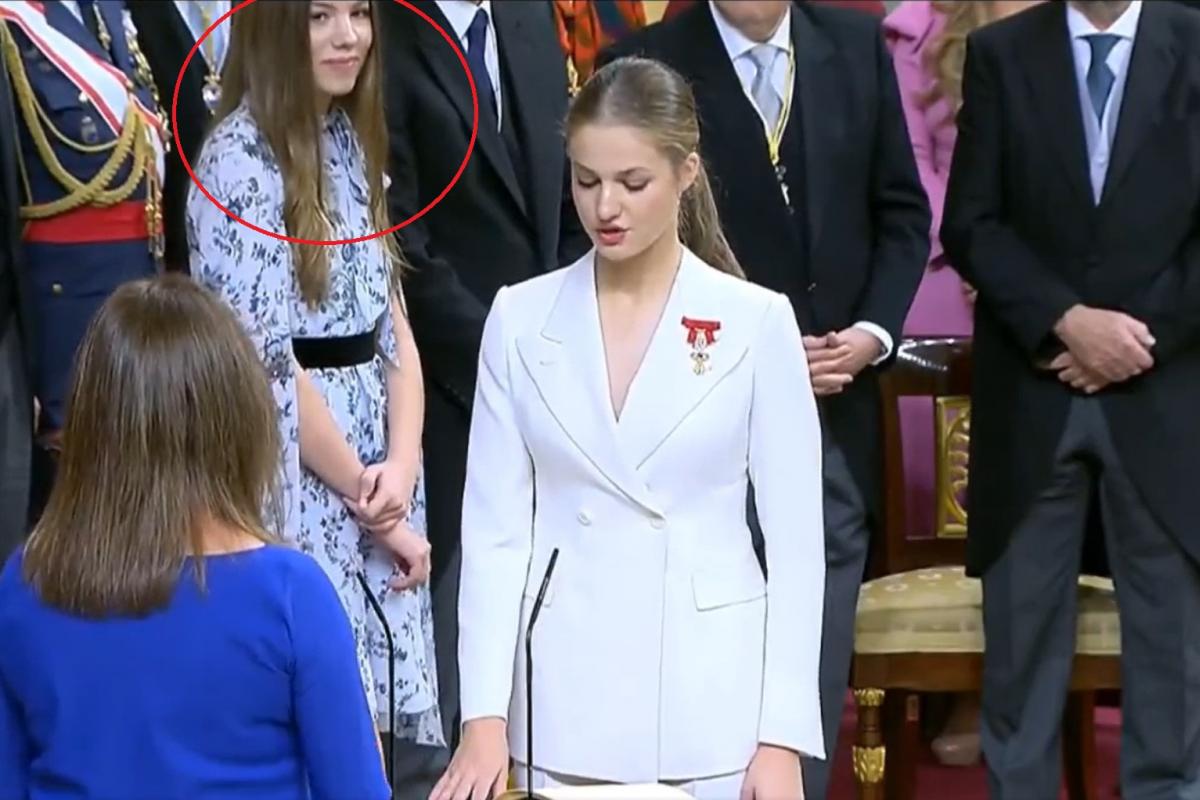 Precisamente Sofía ha tenido su protagonismo mientras Leonor juraba la Constitución. Al fondo, en las imágenes de televisión, se ha visto como sonreía orgullosa mientras su hermana pronunciaba las palabras.