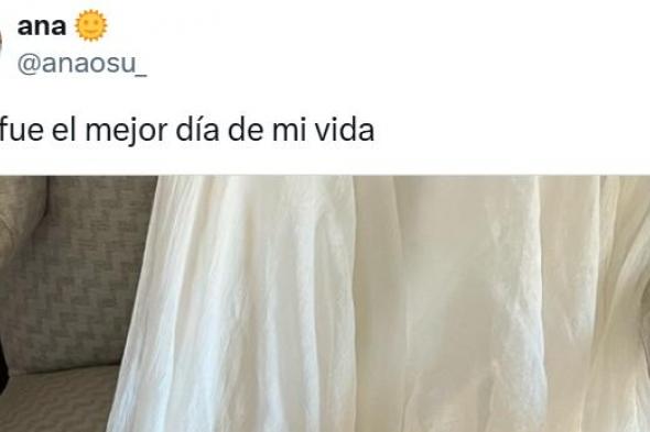 "Ayer fue el mejor día de mi vida", ha publicado la tuitera, justo antes de adjuntar la comentada fotografía, en la que solo se pueden ver los bajos destrozados de un vestido blanco apoyado en un sillón.