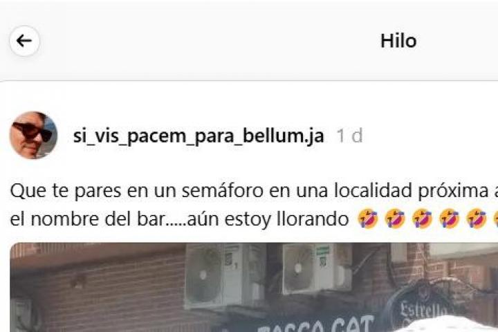 A esa lista hay que añadir otro más: el que ha visto la usuaria de Threads si_vis_pacem_para_bellum.ja, que ha publicado una foto del bar en cuestión junto al mensaje: "Que te pares en un semáforo en una localidad próxima a Valencia y veas detenidamente el nombre del bar... aún estoy llorando".
