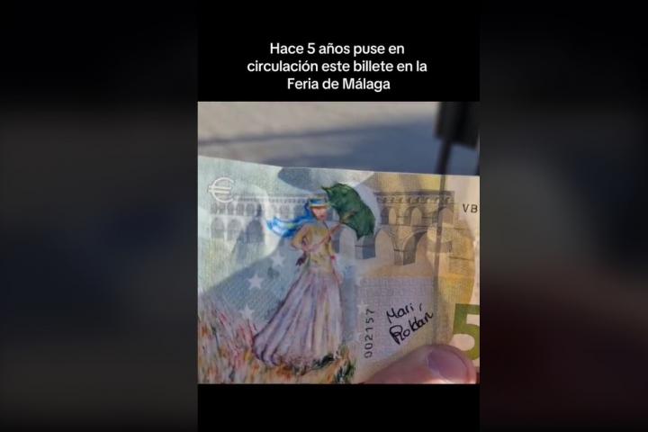Según explica, 'soltó' un billete de cinco euros decorado con su firma hace cinco años en la Feria de Málaga y ahora se ha enterado de qué pasó con ese dinero: su recorrido fue más bien corto.
