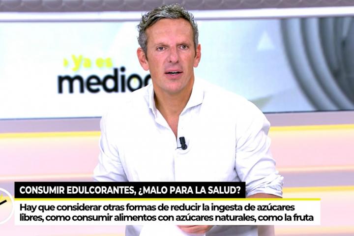 El presentador de Ya es mediodía (Telecinco), Joaquín Prat, ha protagonizado este martes un anecdótico momento después de hacer una recomendación a los espectadores tras informar de los consejos que había dado la Organización Mundial de la Salud (OMS) sobre el consumo de edulcorantes.