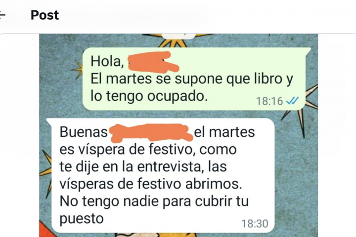 Su jefe le pide que trabaje víspera de festivo, le responde con lo que le tendría que pagar y pasa esto