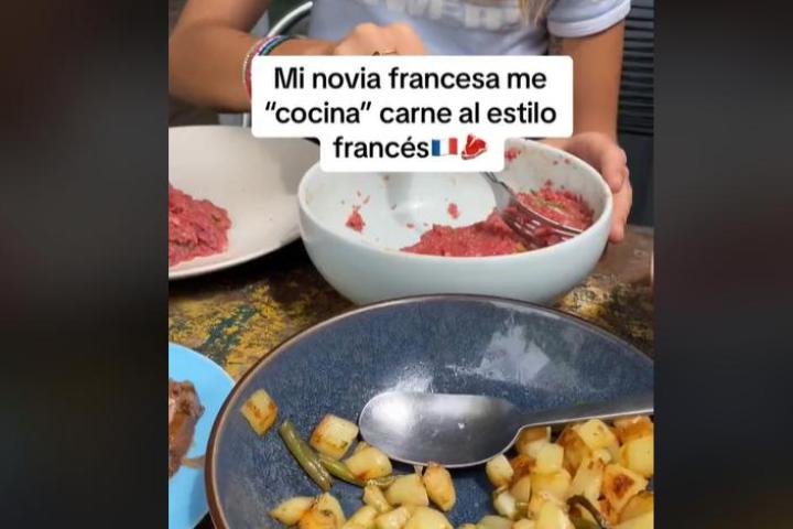 El plato es carne tártara, una receta de carne cruda picada y que se adereza con jugo de limón, acompañado de cebolla, perejil y otros, especialmente con yema de huevo. El vídeo ha acumulado casi 20.000 comentarios con opiniones de todo tipo, especialmente sarcasmos: "¿Sigues vivo?".