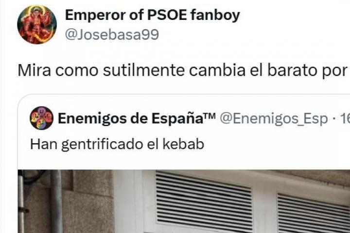 "Mira como sutilmente cambia el barato por brutal", ha comentado el tuitero, quien ha citado la imagen del usuario @Enemigos_Esp de un restaurante especializado en kebab de lo más moderno.