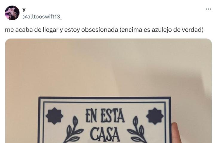 "Me acaba de llegar y estoy obsesionada (encima es azulejo de verdad)", ha tuiteado la usuaria, justo antes de adjuntar la imagen en la que se ve un azulejo decorativo en el que se puede leer: "En esta casa se escucha Taylor Swift".