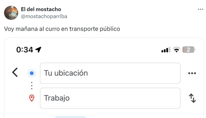 El tuitero @mostachoparriba ha publicado en la red social X, anteriormente conocida como Twitter, una captura de pantalla de la aplicación Google Maps en la que se puede ver cuánto tardaría en llegar a su trabajo si fuese en transporte público.
