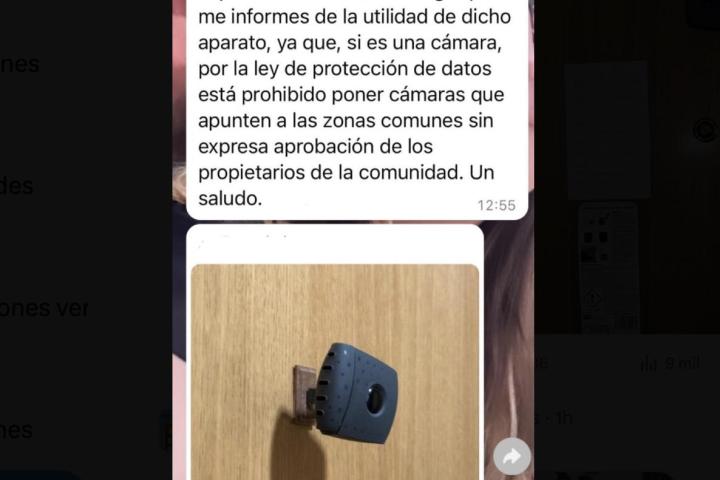"Te ruego que me informes de la utilidad de dicho aparato, ya que, si es una cámara, por la ley de protección de datos está prohibido poner cámaras que apunten a las zonas comunes sin expresa aprobación de los propietarios de la comunidad. Un saludo", terminó el mensaje.