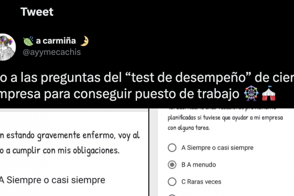 La usuaria @ayymecachis ha publicado en Twitter algunas de las supuestas preguntas de un "test de desempeño" que le han hecho en una empresa para optar a un puesto de trabajo. Las tres cuestiones están relacionadas con el "sacrificio" que la empleada está dispuesta a tener con el negocio, teniendo que renunciar a sus vacaciones e incluso a su sueldo en caso de necesidad.