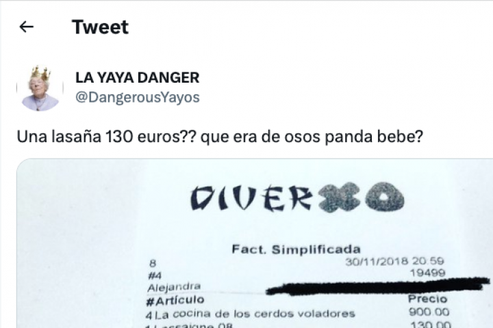"¿Una lasaña 130 euros?? ¿Qué era? ¿De osos panda bebe?", ha escrito junto a la imagen, que ha dado mucho de qué hablar por varios detalles. El primero: la factura no es actual, sino de noviembre de 2018.