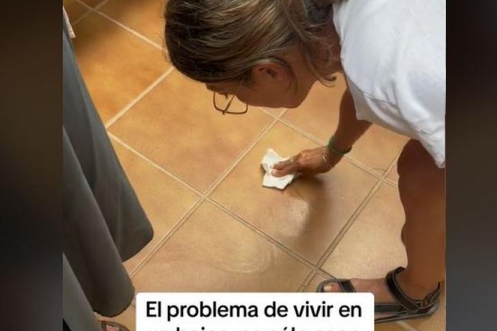 "El problema de vivir en un bajo es que no solo caen pinzas... Mi madre se ha enfadado", ha empezado diciendo mientras mostraba a otra joven limpiar el suelo manchado de cerezas.