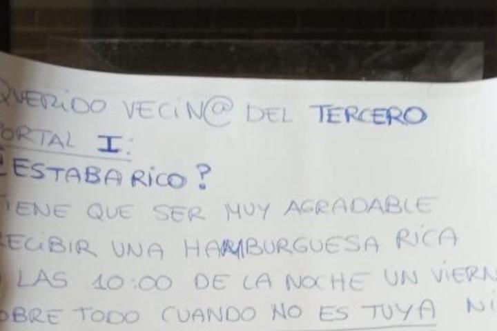 Para que todos se enteren de lo que ha ocurrido, el vecino aludido le ha dejado una nota en mayúsculas al que se quedó son su cena: ¿Estaba rico? Tiene que ser muy agradable recibir una hamburguesa rica a las 10 de la noche un viernes, sobre todo cuando no es tuya ni la has pedido tú. Además dices que la ha recibido el conserje. Todo un gesto por tu parte (bastante feo)".
