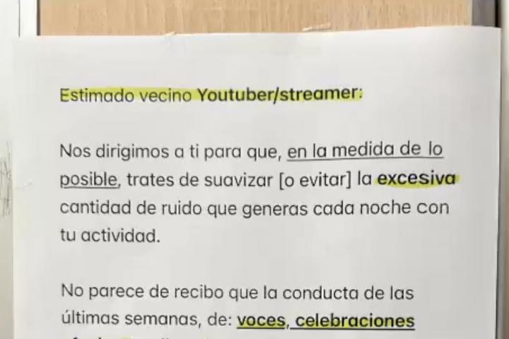 "Estimado vecino Youtuber/streamer... Nos dirigimos a ti para que, en la medida de lo posible, trates de suavizar [o evitar] la excesiva cantidad de ruido que generas cada noche con tu actividad", empieza diciendo el mensaje.