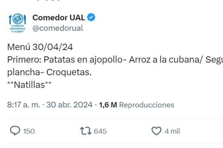 Los menús de la cuenta del comedor de la Universidad de Almería llevan días habiendo la boca agua de todo X.