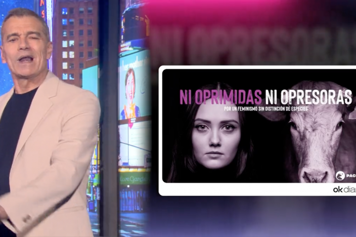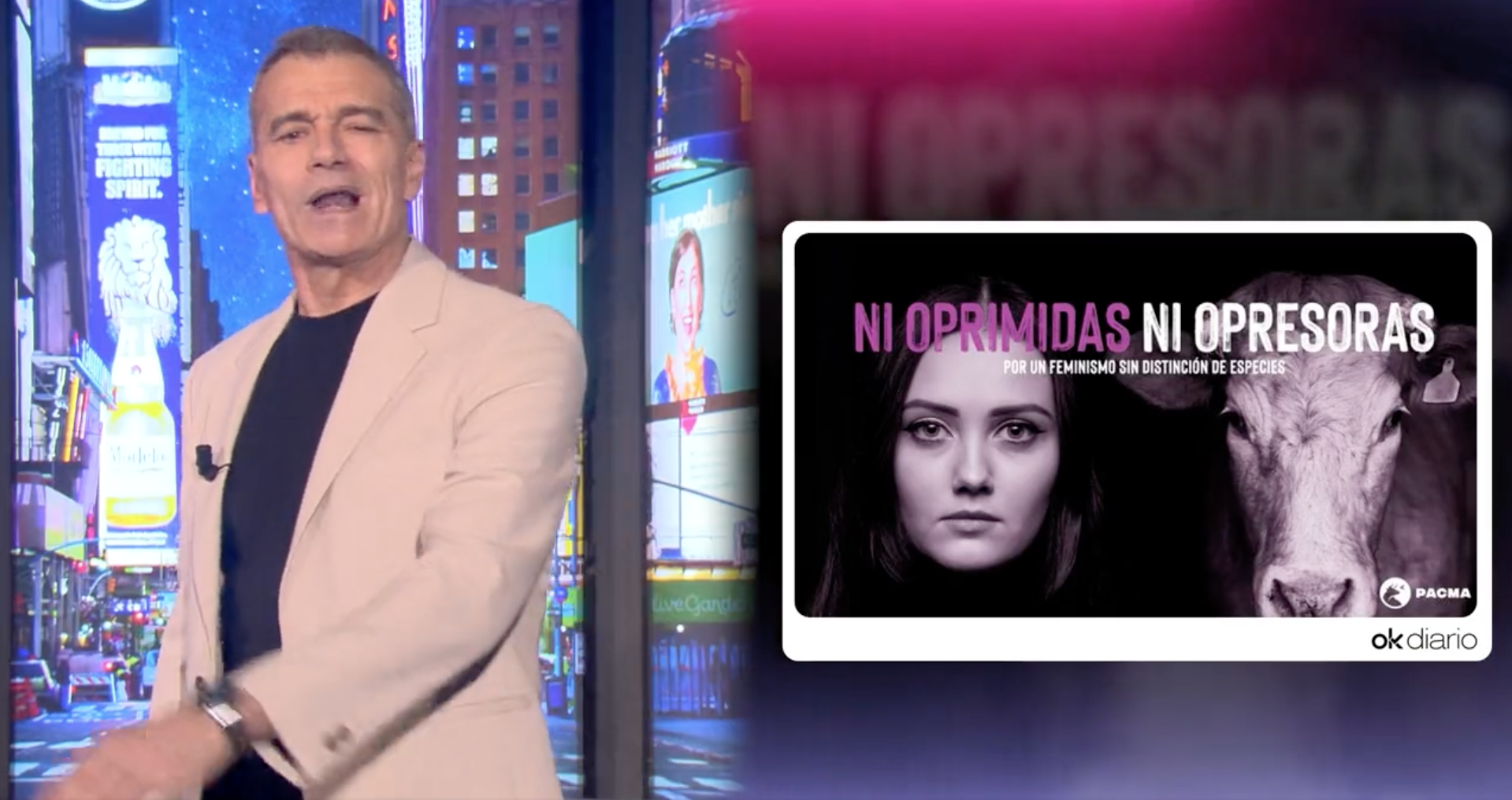 "Otra de las cosas que hemos visto este 8M es una campaña del Pacma un tanto animal. Este cartel es la mejor forma de viajar gratis: compara cualquier mujer con una vaca y de la hostia que te suelta aterrizas en Manchester", ha empezado diciendo.