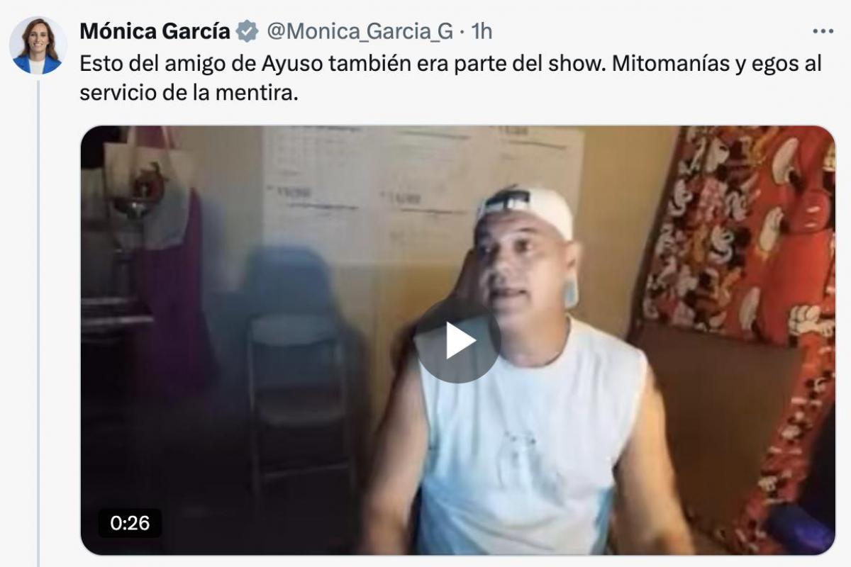 "Esto del amigo de Ayuso también era parte del show. Mitomanías y egos al servicio de la mentira", ha escrito Mónica García junto a un vídeo donde Cuesta llega a decir que "todos estos del Gobierno son una panda de hijos de puta".