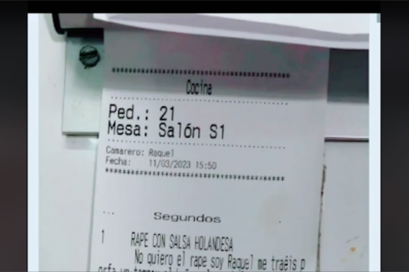 En el ticket de la comanda se ve cómo un supuesto cliente pide rape con salsa holandesa. Pero abajo, en el apartado de observaciones, se ve otro mensaje: "No quiero el rape, soy Raquel. ¿Me traéis porfa un tampax al baño o la mochila de mi coche, que están las llaves en una caja del salón. Gracias?".