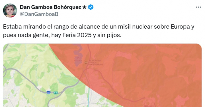 "Estaba mirando el rango de alcance de un misil nuclear sobre Europa y pues nada gente, hay Feria 2025 y sin pijos", ha comentado el tuitero con una buena dosis de humor, justo antes de adjuntar un mapa en el que se puede ver el supuesto alcance que tendría un misil ruso.