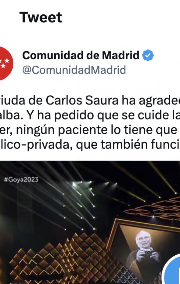 "La viuda de Carlos Saura ha agradecido el trabajo del hospital de Villalba. Y ha pedido que se cuide la Sanidad Pública. Ella no tiene que saber, ningún paciente lo tiene que saber, que ese hospital es de gestión público-privada, que también funciona", han señalado desde la comunidad que preside Isabel Díaz Ayuso, que también ha sido criticada por un mensaje similar.