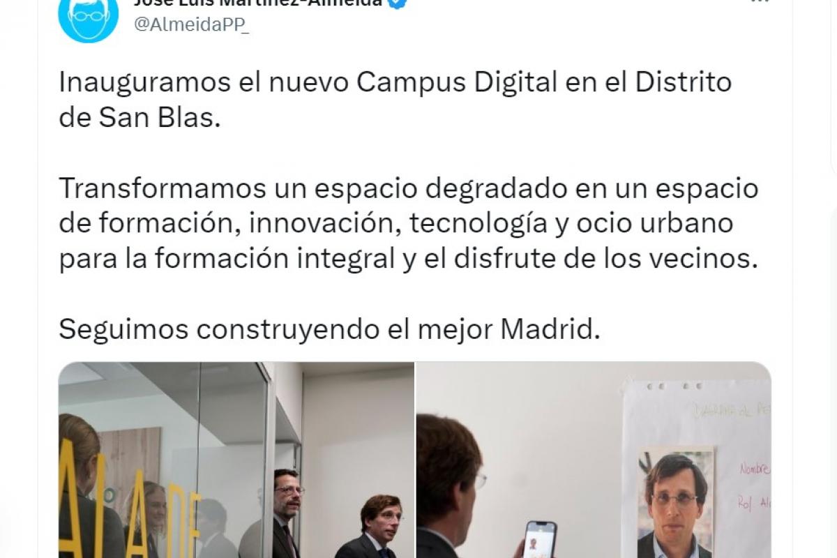 "Inauguramos el nuevo Campus Digital en el Distrito de San Blas. Transformamos un espacio degradado en un espacio de formación, innovación, tecnología y ocio urbano para la formación integral y el disfrute de los vecinos", ha escrito Almeida, asegurando que sigue construyendo el mejor Madrid posible.