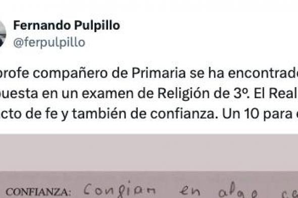 "Un profe compañero de Primaria se ha encontrado esta maravilla de respuesta en un examen de Religión de 3º. El Real Madrid es, sin duda, un acto de fe y también de confianza. Un 10 para ese chaval", ha escrito.