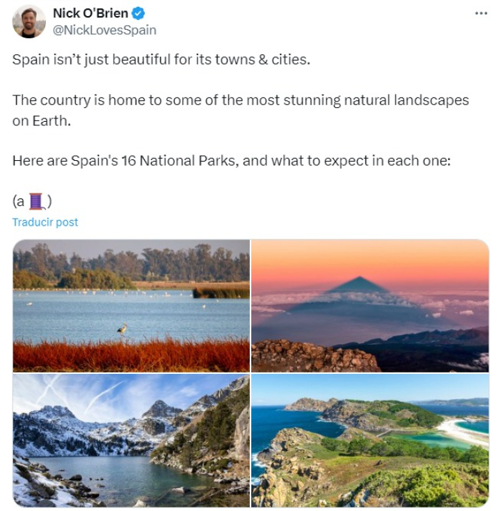 El tuitero Nick O'Brien (@NickLovesSpain), un americano que lleva más de seis años viviendo en España, concretamente en Madrid, ha hecho un hilo en la red social X donde recaba una lista de 16 Parques Nacionales de España que le dejan impresionado.