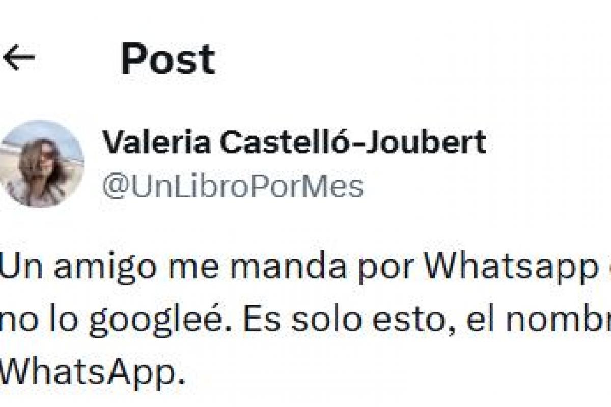 La usuaria Valeria Castelló-Joubert, doctora en Letras por la Facultad de Filosofía y Letras de la Universidad de Buenos Aires, ha explicado en su perfil en la red social X lo que le he pasado tras recibir un mensaje de un amigo por WhatsApp.