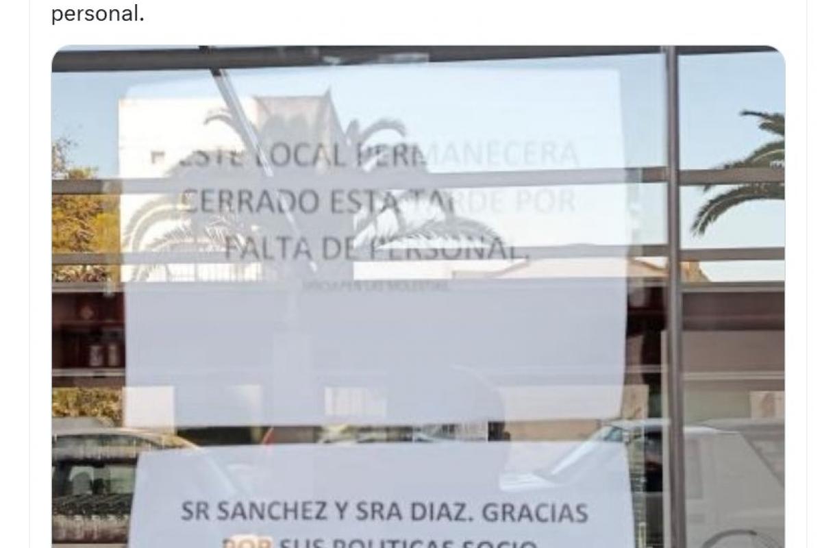 "Este local permanecerá cerrado esta tarde por falta de personal", se lee en el primero de los letreros que ha colocado el hostelero y que ha subido a la red social X la popular cuenta @soycamarero junto al mensaje: "Me gustaría ver las condiciones para tener que cerrar por falta de personal".