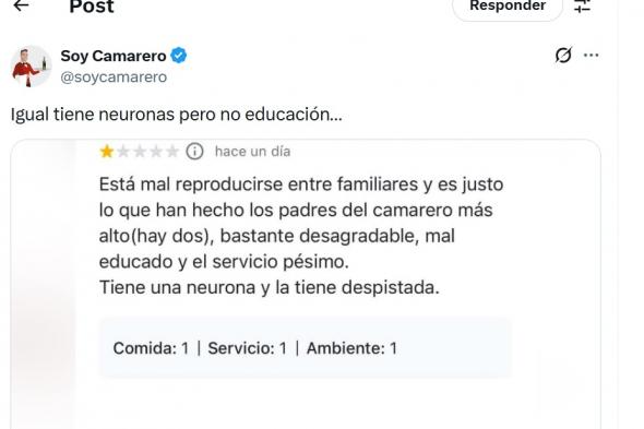 Las reacciones a esta reseña tan irrespetuosa no se han hecho esperar. La cuenta de X @SoyCamarero considera que este cliente "igual tiene neuronas pero no educación…", en referencia a la respuesta del dueño del restaurante.