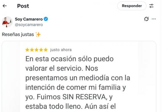 Esto último es lo que le pasó a un cliente de un restaurante, que pese a no encontrar una mesa disponible, tuvo muy buenas palabras para el servicio de dicho local. Y lo hizo a través de una reseña que ha compartido la cuenta de X (@soycamarero). "En esta ocasión solo puedo valorar el servicio", avisa este cliente, que valoró la atención con cinco estrellas.