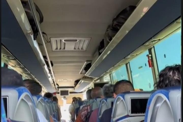 "Vamos a intentar hacer una parada para estirar las piernas. Van ustedes 40 personas al aeropuerto, este mensaje es directamente para ellos: Aquel que no se sienta rumboso, capacitado, con ánimo... que no se baje del autobús, no es obligatorio", ha comenzado diciendo el conductor por megafonía.