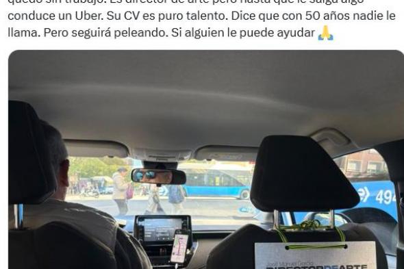 "Voy en un Uber y su conductor ha puesto este cartel. Hace 6 meses se quedó sin trabajo. Es director de arte pero hasta que le salga algo conduce un Uber. Su CV es puro talento. Dice que con 50 años nadie le llama. Pero seguirá peleando. Si alguien le puede ayudar", ha escrito la periodista junto a la foto.