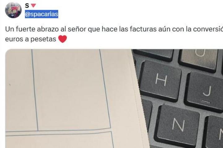 Ha sido la tuitera @spacarias la que ha compartido la imagen de una factura en la que se ve que la persona que la había enviado había añadido el valor que tenía que pagar tanto en pesetas como en euro.