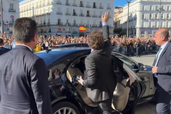 A su llegada a la Puerta del Sol de Madrid, Javier Milei se bajó del coche y saludó a las decenas de personas que se habían congregado frente a la sede del Gobierno de Isabel Díaz Ayuso.